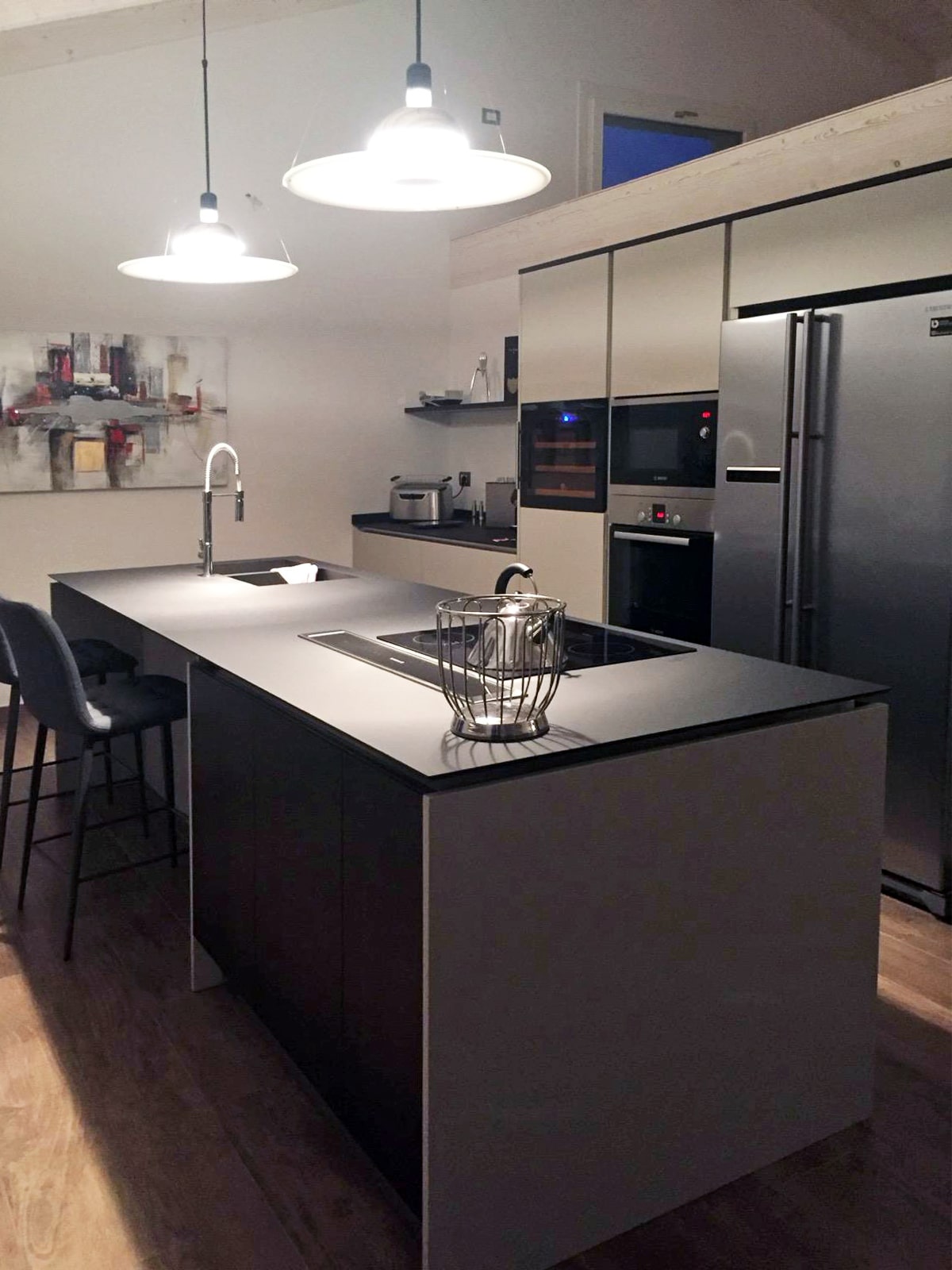 Isola centrale con top in Fenix, materiali pregiati e linee pulite. Un elemento di carattere che unisce stile e praticità.