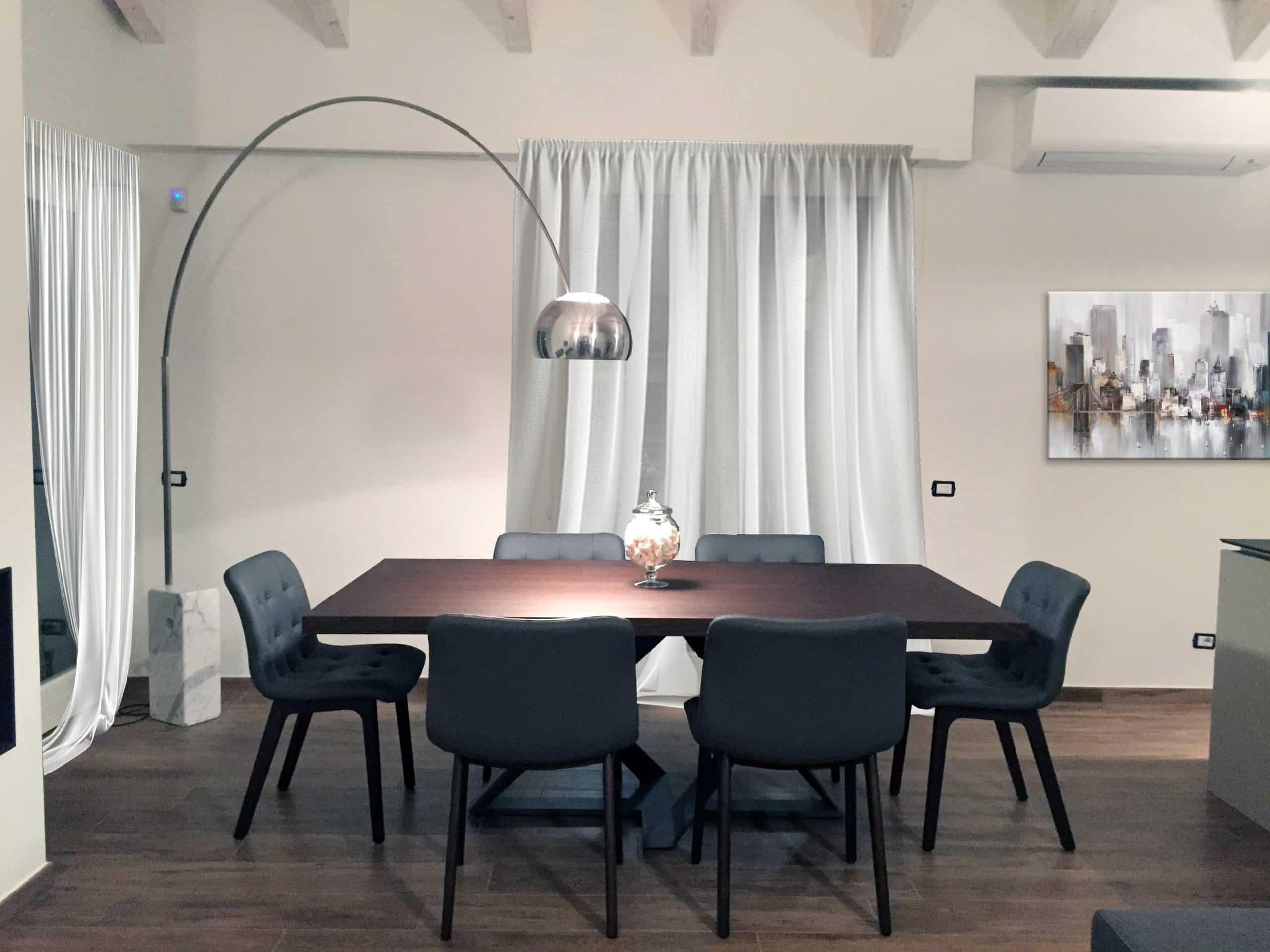 - Dettagli di carattere: L’iconica lampada Arco di Flos, il tavolo Bontempi, sedie di design, completati da accessori minimal.