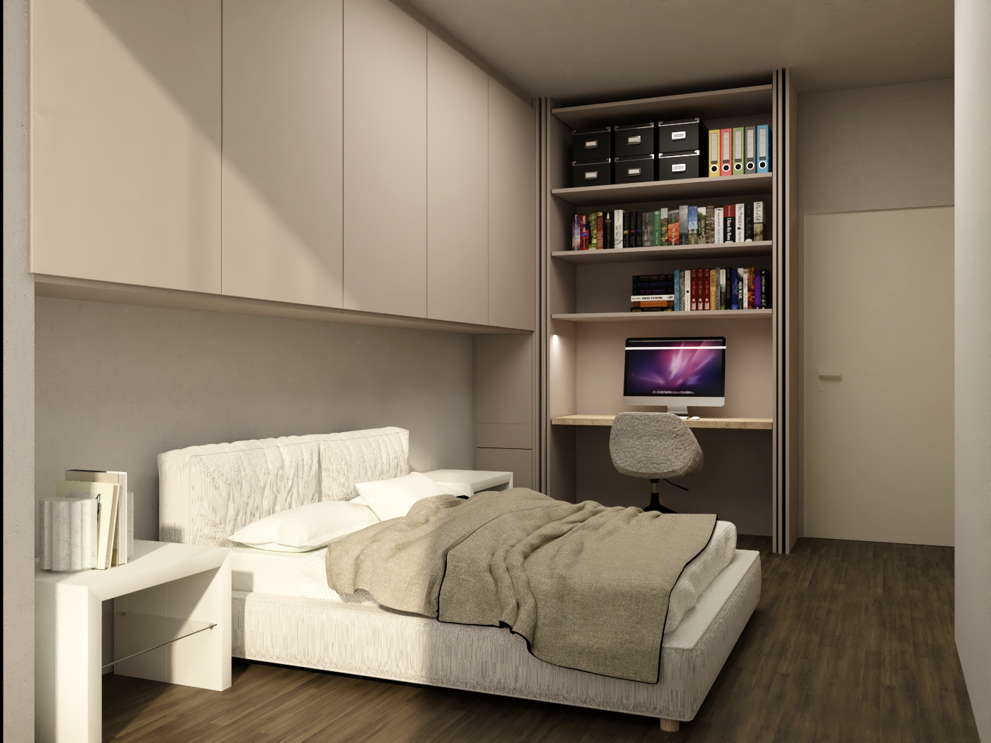 - Camera su misura: Armadio a terra, armadio a ponte e scrivania richiudibile, nascosta dietro ante coordinate.